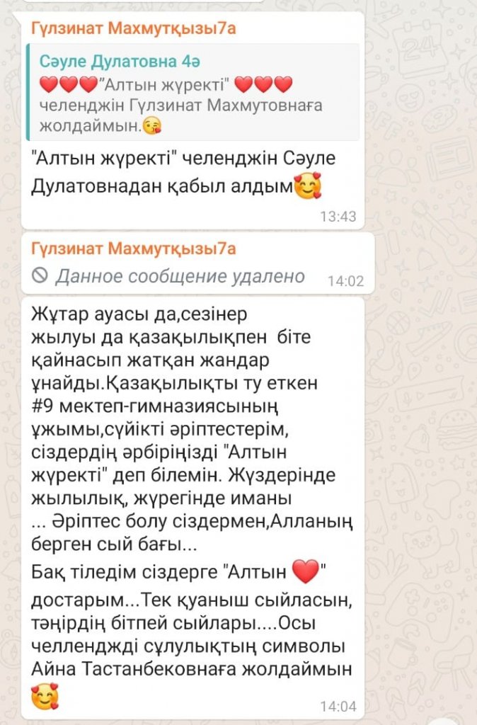 №9мектеп-гимназиясының мұғалімдерінің арасында «Алтын жүрек» челленджi өттi, оның мақсаты жас ұрпақтың жоғары рухани-адамгершiлiк, әлеуметтiк және жеке қасиеттерiн қалыптастыру және дамыту болды.Өзін -өзі тану пәнінің "Шығармашылық пен сүйіспеншілік тақырыбындағы он күндік декадасына өз әріптестеріне мейірімді сөздермен лебіздерін білдірген ұжым "Алтын жүрек"челенджін бір біріне жылу жүрекпен ұсына біліп ,атсалысты.Челлендж аясында көптеген жылы сөздер айтылды. Бейнероликтерде мұғалімдер адам мейiрiмдiлiгi олар үшiн ненi бiлдiретiнi туралы өз пiкiрлерiмен бөлiстi, олардың өздерi адамдарға мейiрiмдiлiктi, қамқорлық пен мейiрiмдiлiктi қалай көрсететiнi туралы айтты.
